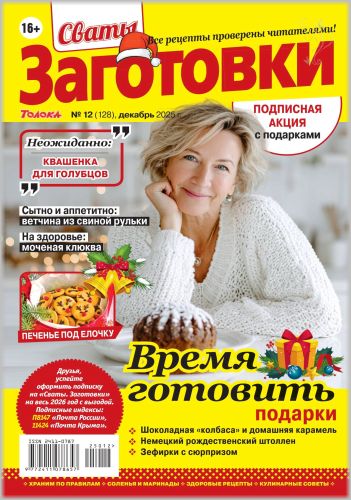 ![]() «Сваты. Заготовки» - ежемесячное издание, посвященное теме заготовок! Более 100 рецептов заготовок от Сватов в каждом номере: соленья и маринады, салаты и ассорти, соусы и приправы, заготовки к сезону, сладкие заготовки, напитки, винный погребок, мясные деликатесы, здоровые рецепты, целебные заготовки, дачные хлопоты, правила хранения, а также кроссворды и сканворды для досуга. |
