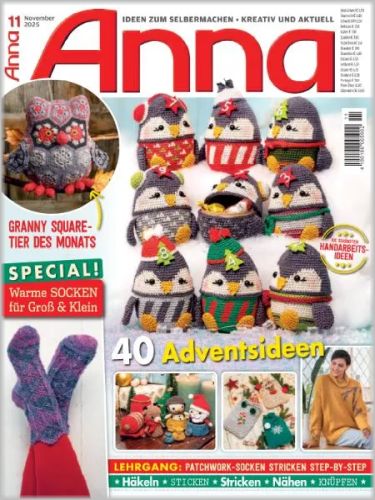 В этом выпуске Anna вы найдете 40 идей для украшения, подарков и просто для хорошего настроения. Как насчет вязаных крючком пингвинов в зимних нарядах? В них можно спрятать 24 маленьких сюрприза. Дарить подарки вдвойне приятно в красивых подарочных пакетах. Красивые, изысканные вязаные изделия обеспечат максимальный стиль и комфорт. Наша специальная рубрика посвящена носкобезопасности, и в довершение всего, здесь есть мастер-класс по вязанию носков в стиле пэчворк. Наше животное месяца в Granny Square — сова Эмма. Наш маленький Полярный экспресс прибывает с оленями, Санта-Клаусом и рождественской елкой. А вязаный крючком пряничный домик выглядит так аппетитно, что его хочется съесть. Еще одна изюминка — наши вязаные крючком продукты для продуктового магазина. Глаза детей загорятся, когда они найдут это под елкой! И это еще не все: вязанное узелковое настенное украшение с подходящей подушкой или декоративный утеплитель для защиты от сквозняков, связанный крючком в технике гобелен. У нас также есть кое-что для любителей вышивки крестиком. С нетерпением ждём ваших новых творческих проектов!