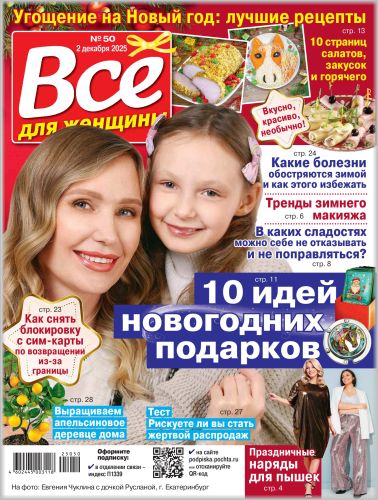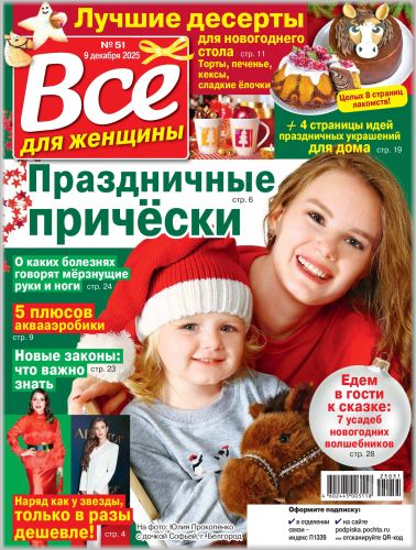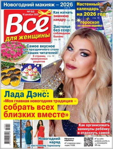 «Все для женщины» - самый популярный женский журнал, призванный облегчить и украсить жизнь своих читательниц. Дает оригинальные, но простые и актуальные советы по всем сторонам жизни современной женщины. Предлагает читательницам опыт других женщин и лучших экспертов. Журнал вдохновляет женщин, делая их жизнь насыщенной и комфортной. Более 100 идей в каждом номере.