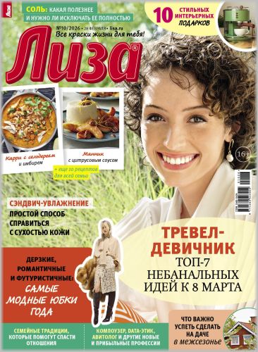 Самый популярный в России еженедельный журнал для женщин «Лиза»! Фитнес со звездой и звездный макияж, уроки стиля и самые горячие новости из жизни кумиров. А еще – модный шопинг, актуальная мода, новинки косметики и великолепные идеи для дома. Романтические истории о настоящей любви и рассказы читательниц о разных жизненных ситуациях и многое другое.