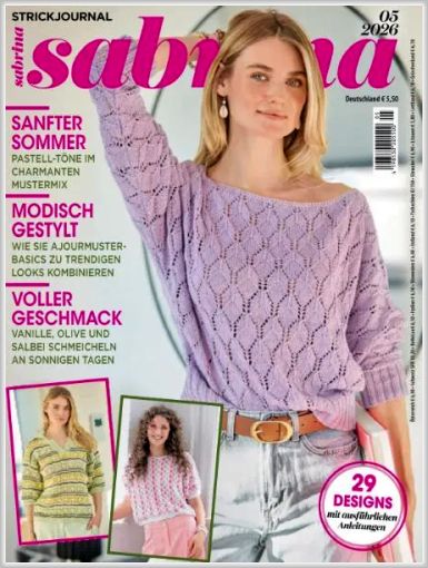 Лето начинается прекрасно и гармонично в нашей текущей коллекции Sabrina No. 5/2026: тонкое и элегантное сочетание ванили, шалфея и оливкового цвета идеально подходит для стильного образа в офисе и за его пределами. Для еще более воздушных моментов идеально подойдут наши ажурные модели в светло-голубых оттенках. Они обладают успокаивающим, расслабляющим эффектом и прекрасно сочетаются с яркими цветами. Наше любимое творение — сочетание сиреневого трикотажа и плотного денима — неожиданное сочетание для законодателей моды! Для вязальщиц, которые любят особенно женственные наряды, у нас есть романтические вязаные свитера, платья и кардиганы в розовых и серых оттенках. Они источают чувственность, которая еще больше подчеркивается гармоничным и воздушным сочетанием узоров. Как всегда, подробные инструкции по вязанию прилагаются ко всем нашим моделям трикотажных изделий.