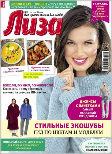 Самый популярный в России еженедельный журнал для женщин «Лиза»! Фитнес со звездой и звездный макияж, уроки стиля и самые горячие новости из жизни кумиров. А еще – модный шопинг, актуальная мода, новинки косметики и великолепные идеи для дома. Романтические истории о настоящей любви и рассказы читательниц о разных жизненных ситуациях и многое другое.