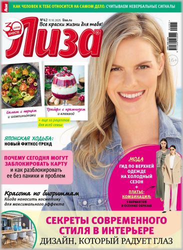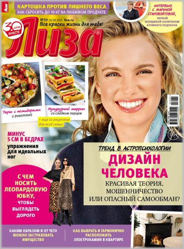 Самый популярный в России еженедельный журнал для женщин «Лиза»! Фитнес со звездой и звездный макияж, уроки стиля и самые горячие новости из жизни кумиров. А еще – модный шопинг, актуальная мода, новинки косметики и великолепные идеи для дома. Романтические истории о настоящей любви и рассказы читательниц о разных жизненных ситуациях и многое другое.