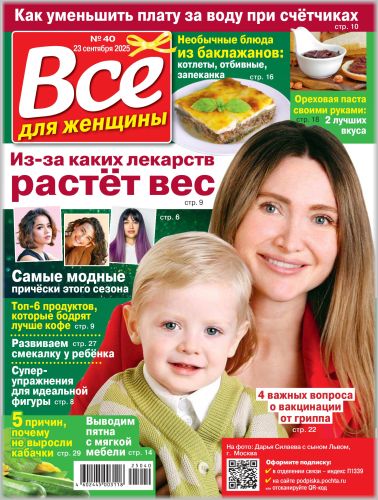 «Все для женщины» - самый популярный женский журнал, призванный облегчить и украсить жизнь своих читательниц. Дает оригинальные, но простые и актуальные советы по всем сторонам жизни современной женщины. Предлагает читательницам опыт других женщин и лучших экспертов. Журнал вдохновляет женщин, делая их жизнь насыщенной и комфортной. Более 100 идей в каждом номере.